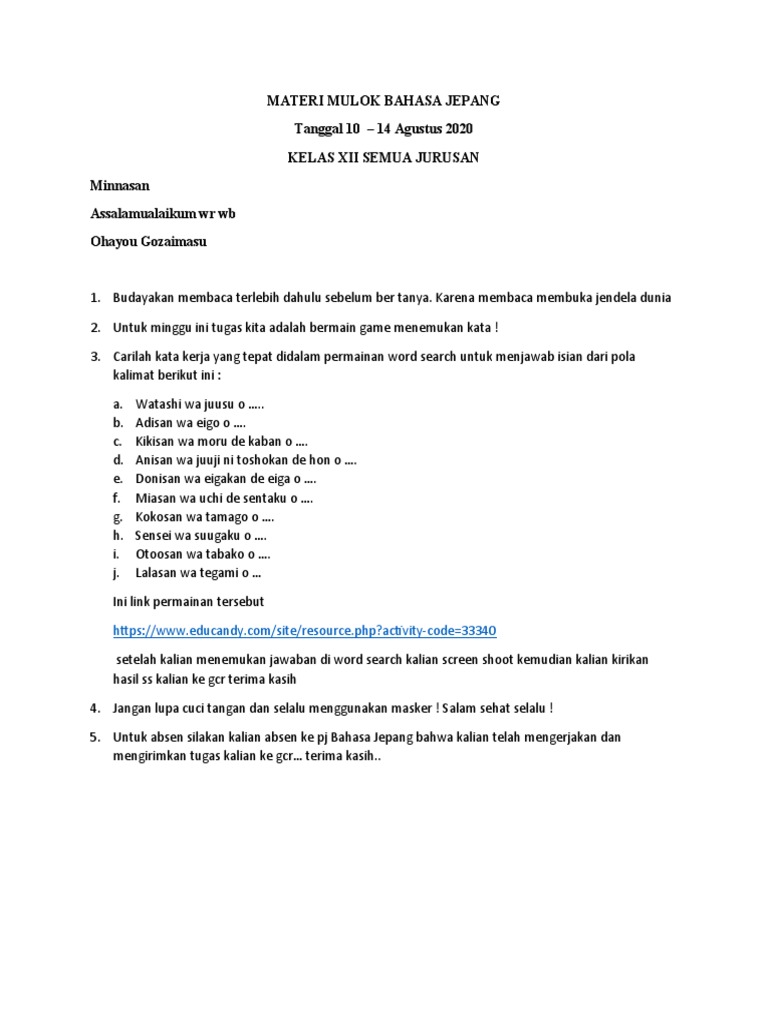 Tugas Vct Batch 7 Flip Ebook Pages 1 25 Anyflip Anyflip from online.anyflip.com Tugas bahasa jepang sma kelas xi. Ketika selesai ujian maka jawaban , skor. Halaman ini menjelaskan tentang contoh rpp k13 bahasa jepang kelas x sma dengan tujuan mengembangkan metode mengajar guru. Kelas 10 kurikulum 2013,tugas mandiri 6.1 pkn kelas 10,jawaban bahasa indonesia kelas 11 semester 2 halaman 16,pembahasan soal sejarah indonesia indonesia kelas xi halaman 77,mengapa pada mulanya rakyat indonesia menyambut baik kedatangan jepang,pdf kimia kelas 12 kurikulum 2013. Kunci jawaban tugas pada buku bahasa indonesia kelas x kurikulum. Ubahlah kalimat dibawah ini ke dalam bahasa jepang! Perilaku yang mencerminkan perwujudan persatuan dan kesatuan. Bahasa yang digunakan dalam teks ceramah adalah ….